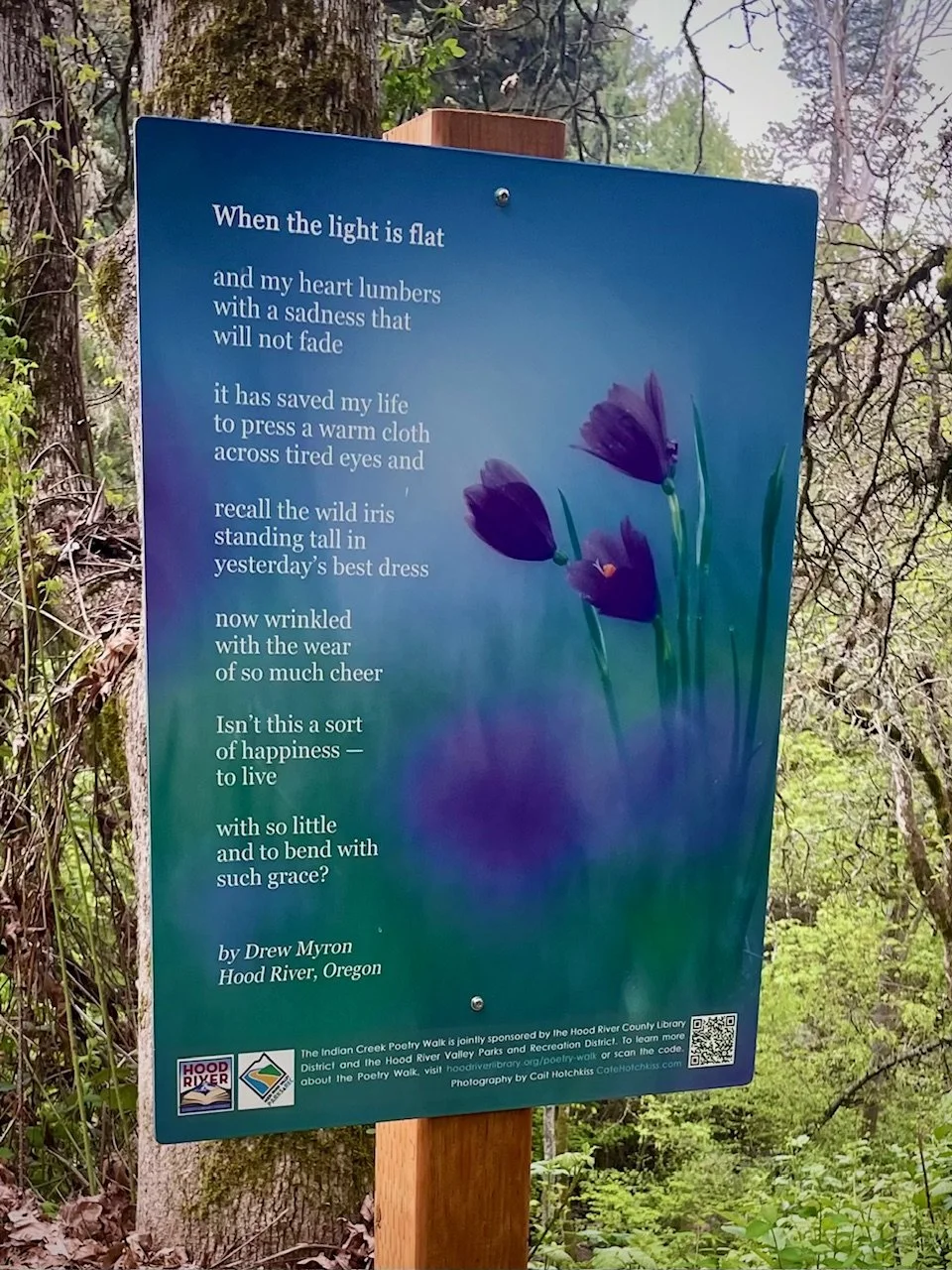 The 2026 Indian Creek Trail Poetry Walk features 20 poems placed along a walking path in Hood River, Oregon.